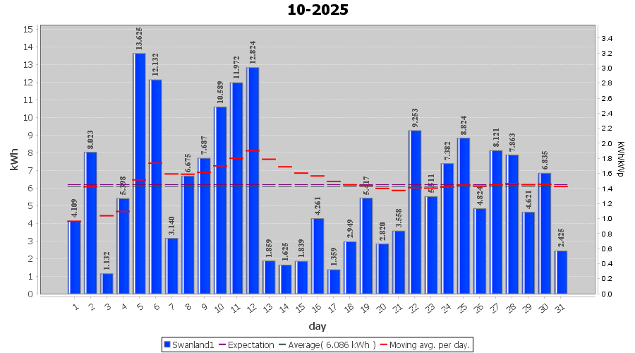 | 6-10-2025 | kWh | W/Wp | 12.132 | 4000 | 3.0 | 5.611 | £ 12.73 | 6.4 | |